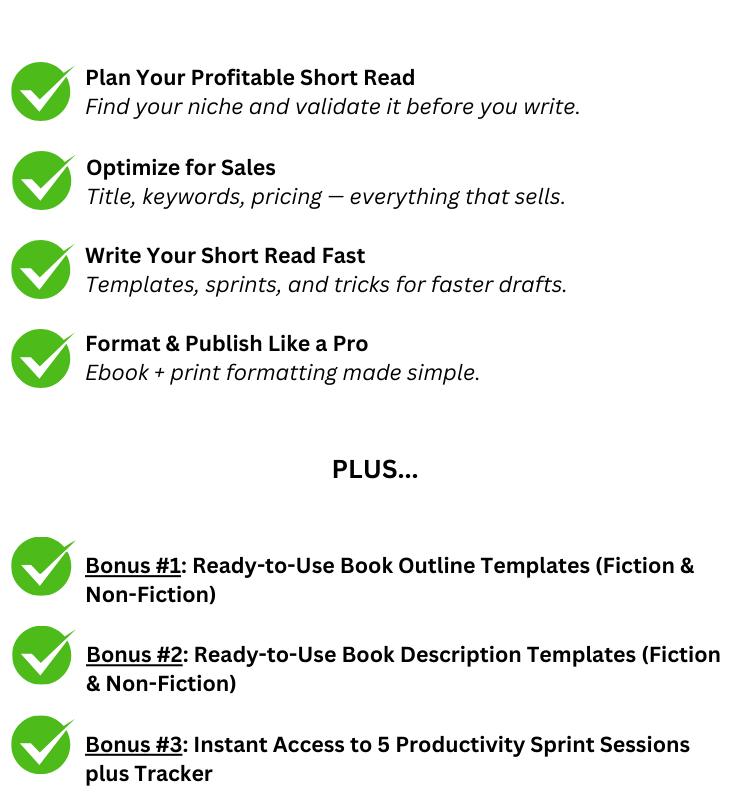 A: In Short Read Domination I cover both Fiction and Non-Fiction topics. In fact, the templates that I provide you access to have both Fiction and Non-Fiction variations. The truth is there are audiences for short reads in both Fiction and Non-Fiction niches. In the course, I'll show you how to determine which niche is best for you, specifically.